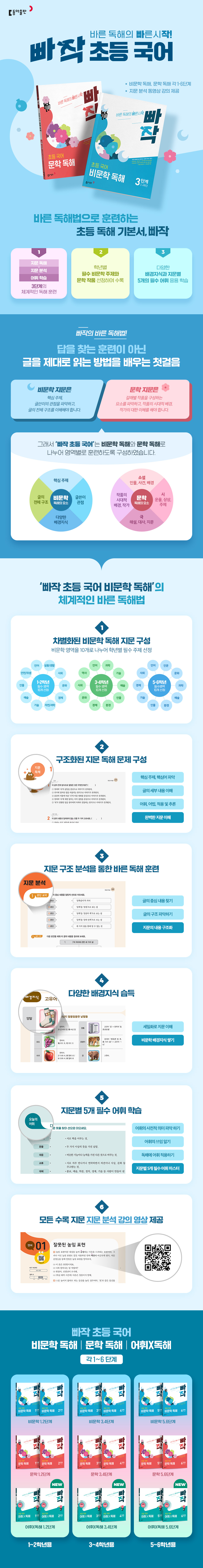 바른 독해법으로 훈련하는 비문학 독해 기본서이다. 지문 독해-지문 분석-어휘 학습의 3단계 독해 훈련으로 구성하였다. 학년별 10개 영역으로 세분화된 지문으로 깊이 있는 독해 학습이 가능하며 다양한 배경지식·어휘를 응용 학습할 수 있다.