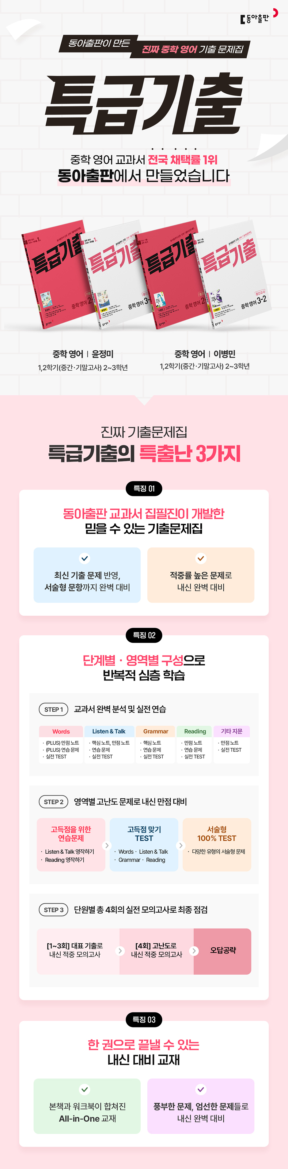 이 책은 동아출판㈜ 「Middle School English 3 (이)」 교과서를 공부하는 학생 여러분이 단계별·영역별 반복형 심층 학습을 통해 교과서 내용을 완벽하게 이해하고, 적중률 높은 최신 유형 문제로 서술형 평가와 수행평가를 포함한 모든 종류의 학교시험에 철저히 대비할 수 있도록 구성하였다.