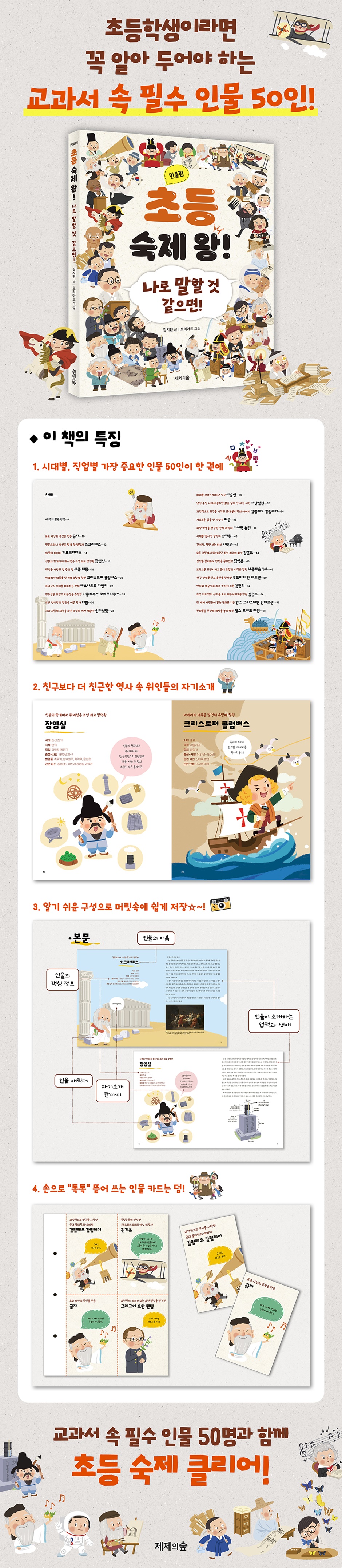 이 책, 『초등 숙제 왕! 인물편 - 나로 말할 것 같으면!』에는 교과서에 나오는 전 세계 인물 가운데 50명을 시대별, 직업별로 골고루 뽑아 소개한다. 하지만 다른 책과 비슷한 인물에 대한 일반적인 소개 글이 아니다. 교과서 속 인물이 책을 보는 친구들에게 스스로 자신을 소개하기 때문이다. 새 학년에 올라가 새롭게 만난 반 친구들에게 자기소개를 하는 것처럼 자신만의 개성을 담아 핵심만을 추려 이야기한다. 또한 각 인물마다 펼침 한 면에 그림과 사진 자료를 적절히 배치해 인물에 대해 한눈에 알 수 있도록 구성했으며, 그 핵심 내용만을 모아 직접 숙제 자료로 활용할 수 있는 인물 카드 부록까지 함께 담았다. 절취선이 있어서 손으로 쉽게 뜯어서 학교 숙제로 활용이 가능하다.