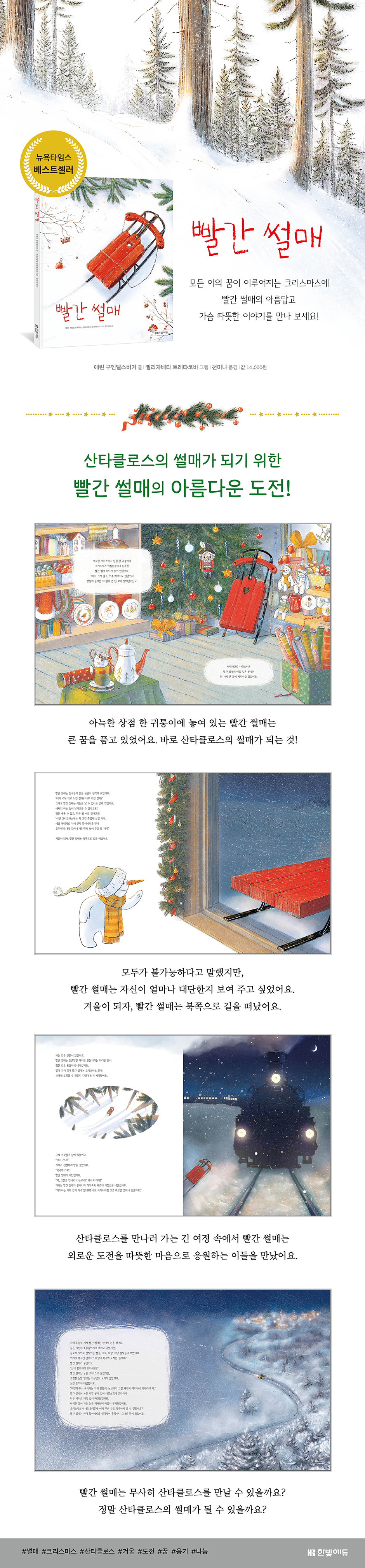 빨간 썰매의 아름다운 도전 이야기!아늑한 상점 한 귀퉁이에 놓여 있는 빨간 썰매는 한 가지 큰 꿈을 간직하고 있었어요. 바로 산타클로스의 썰매가 되는 것이지요. 상점 안의 친구들은 하나같이 절대로 이루어질 수 없는 꿈이라고 말했어요. 하지만 빨간 썰매는 비록 너무 작고 느리고 어리지만, 꼭 꿈을 이룰 수 있을 거라고 굳게 믿었어요. 겨울이 되자 빨간 썰매는 북쪽으로 길을 떠났어요. 빨간 썰매는 산타클로스를 만날 수 있을까요? 정말 산타클로스의 썰매가 될 수 있을까요?