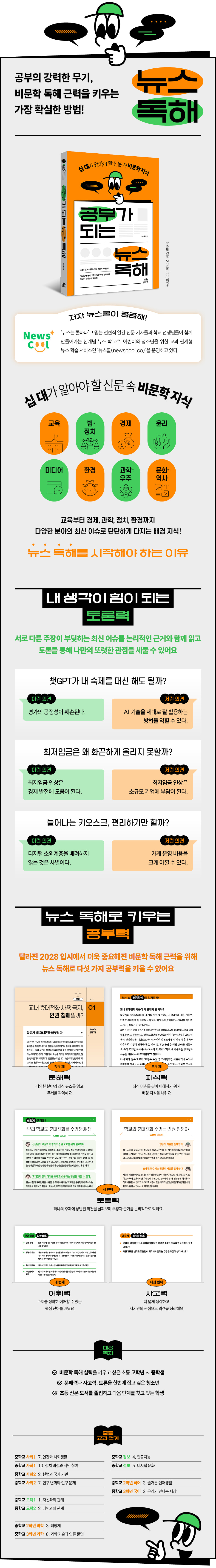 전현직 신문 기자와 학교 선생님으로 구성된 저자 뉴스쿨은 교육부터 경제, 과학, 정치, 환경까지 중등 독해력을 키우기 적합한 주제를 선별해 뉴스로 읽고 토론으로 생각할 수 있는 책을 구성했다. 『공부가 되는 뉴스 독해』는 다양한 분야의 배경지식과 풍부한 어휘를 제공하고, 하나의 주제로 생각해 볼 수 있는 상반된 의견들을 통해 논리력과 토론력을 키워준다.