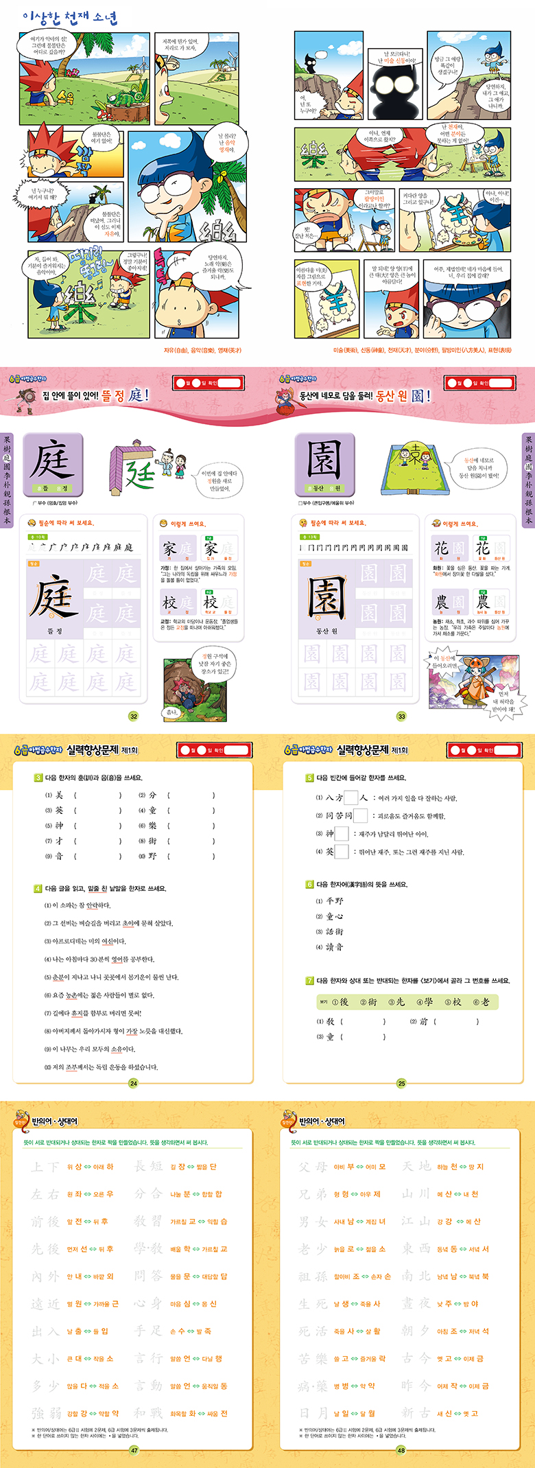 주제별로 묶어 놓은 낱자들을 재미있는 단컷 만화와 한자의 이미지와 음과 훈이 절로 연상되는 주문을 통해 익힐 수 있습니다. 음과 훈, 획순, 부수, 낱말 등을 재미있게 익힌 후에 쓰기 연습을 해 보는 코너입니다.