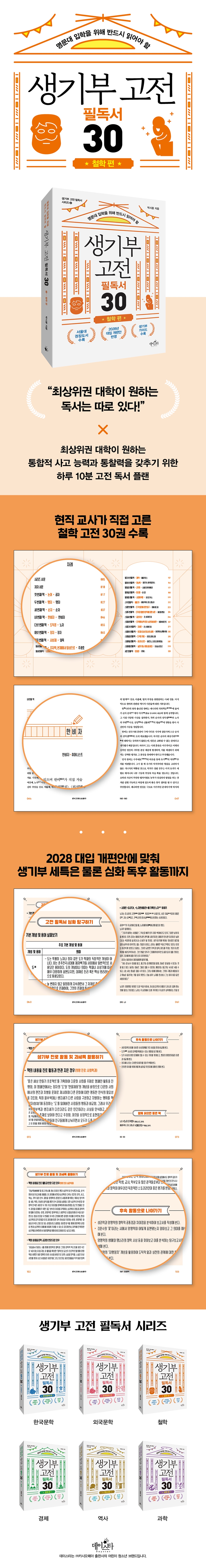 이번 시리즈의 세 번째 책인 『생기부 고전 필독서 30 철학 편』은 유명한 서른 권의 철학 고전을 통해 모든 학문의 기초이자 뿌리인 철학을 쉽고도 흥미롭게 소개한다. 공자의 「논어」, 이황의 「성학십도」, 이이의 「성학집요」와 같은 동양철학에 대한 고전뿐 아니라 플라톤의 「국가」, 마키아벨리의 「군주론」, 밀의 「공리주의」와 같은 서양철학 고전도 담고 있어 동서양의 철학이 어떻게 다르고 어떤 점에서 서로 영향을 주고받았는지 두루 비교해 볼 수 있다. 특히 각 고전을 입체적으로 읽을 수 있도록 교과와 연계하여 활용할 수 있는 탐구 주제와 방향, 학교생활기록부의 진로 활동 및 세특에 반영할 구체적인 예시와 방법도 소개하고 있어, 독서와 연계하여 학생부종합전형을 대비할 수 있는 최고의 방법이 되어 줄 것이다.
