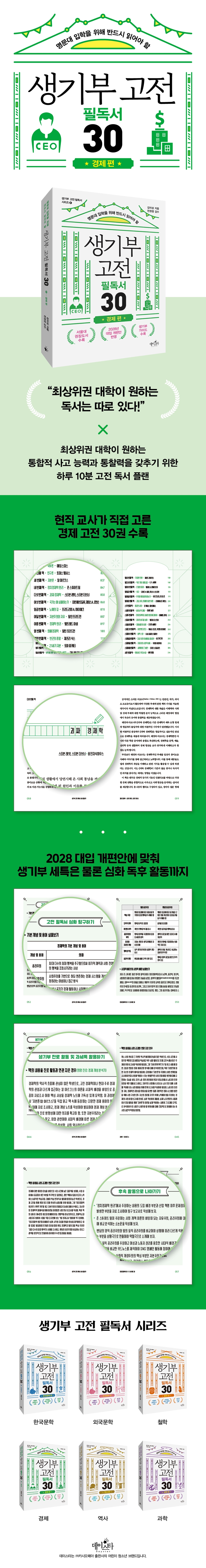 이번 시리즈의 네 번째 책인 『생기부 고전 필독서 30 경제 편』은 인간의 행동과 사회구조를 이해하는 데 중요한 통찰을 제공하는 경제학 분야의 고전 30권을 엄선하여 소개한다. 저자는 “경제학의 본질과 복잡성을 파악하기 위해서는 이론과 분석의 기초를 다지는 것이 중요하며, 기초를 탄탄히 다지는 방법 중 하나가 바로 경제 고전을 깊이 읽는 것”이라고 강조한다. 이 책은 각 작품에 대한 설명과 함께 학생들이 반드시 알아야 할 핵심 개념과 이론을 정리하고, 이와 함께 이론을 실제 사례에 어떻게 적용할 수 있는지 구체적인 예시를 통해 설명한다. 또한 경제 고전을 읽는 것으로 끝나는 것이 아니라 이후 어떤 학문적 질문을 던져야 하는지, 어떻게 비판적 사고로 연결시킬 수 있는지에 중점을 두고 구체적인 가이드를 제시한다. 특히 교과와 연계하여 활용할 수 있는 탐구 주제와 방향, 학교생활기록부의 진로 활동 및 세특에 반영할 구체적인 예시와 방법도 소개하고 있어, 독서와 연계하여 학생부종합전형을 대비할 수 있는 최고의 방법이 되어 줄 것이다.