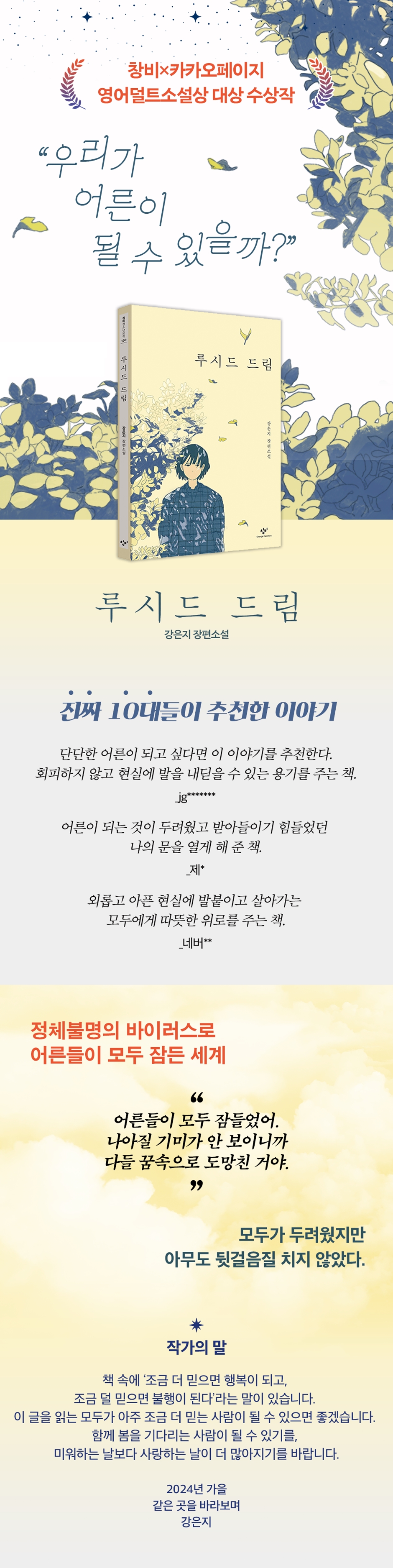 『루시드 드림』을 쓰면서 고등학생 시절 책상에 가만히 앉아 있는 제가 자주 떠올랐습니다. 어떤 선택이 옳은지, 어떤 길을 가야 할지 막막하기만 했던 때가 있었습니다. 누구의 조언도, 위로도 내게 닿지 않았고 혼자 모든 걸 결정해야 한다는 강박에 시달렸을 무렵 꼭 글을 쓰는 사람이 되어야겠다고 다짐했습니다. 『루시드 드림』은 그때의 저에게 전해 주고 싶은 이야기입니다. 가끔 딴 길에 들어서더라도 끝내 돌아올 수 있다고. 길을 헤매는 건 누구의 잘못도 아니라고.