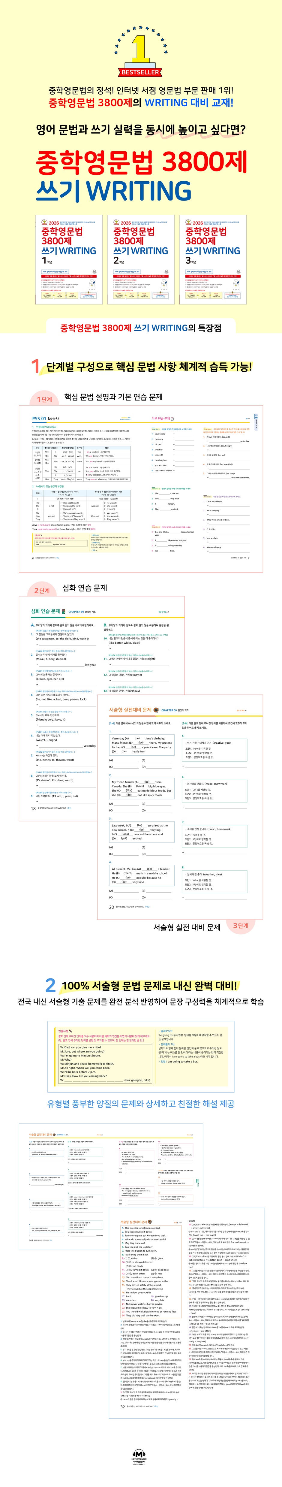 영문법 판매 1위, 중학영문법 3800제의 Writing 대비 교재이자 100% 서술형 문법 문제를 수록하였다.