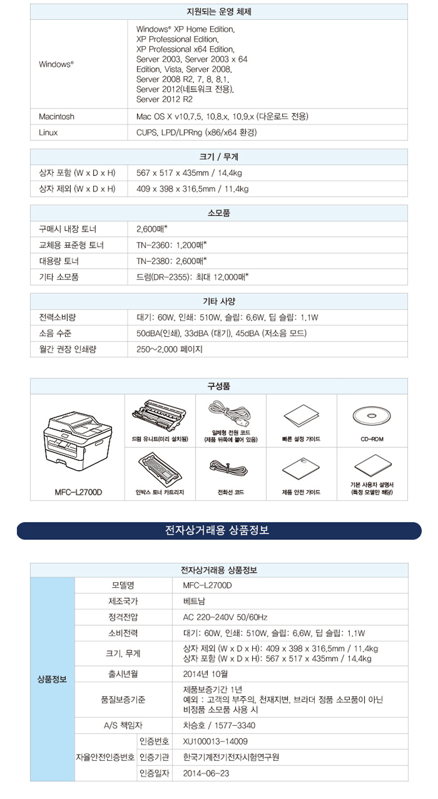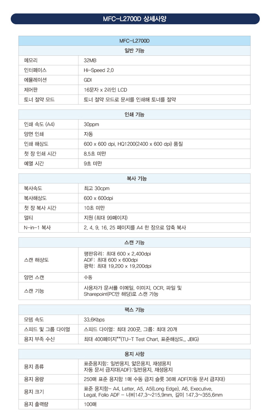 브라더 MFC-L2700D (토너포함) 고속 흑백 레이저복합기 프린터 / 양면인쇄