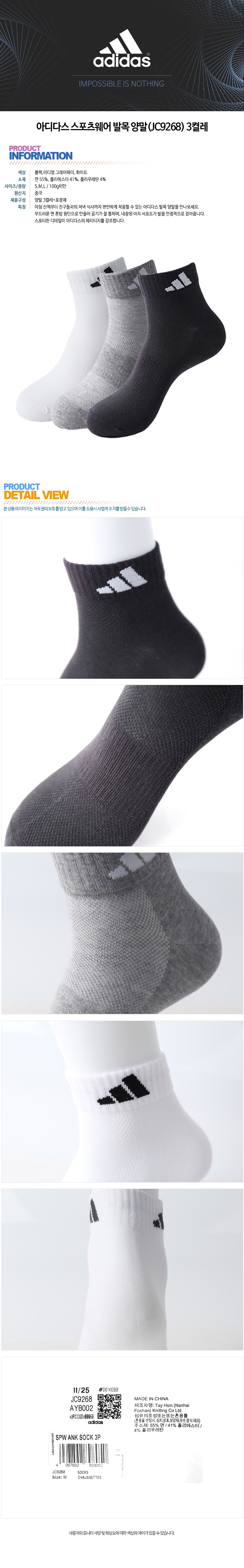 아디다스 스포츠웨어 발목 양말(JC9268) 3켤레