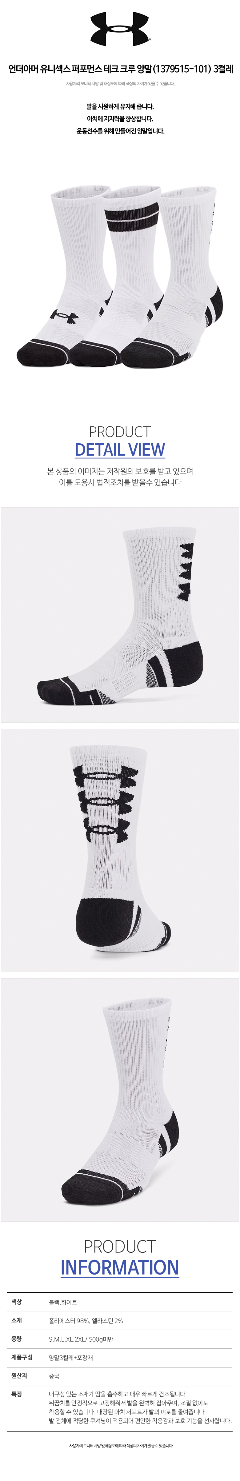 언더아머 유니섹스 퍼포먼스 테크 크루 양말(1379515-101) 3켤레