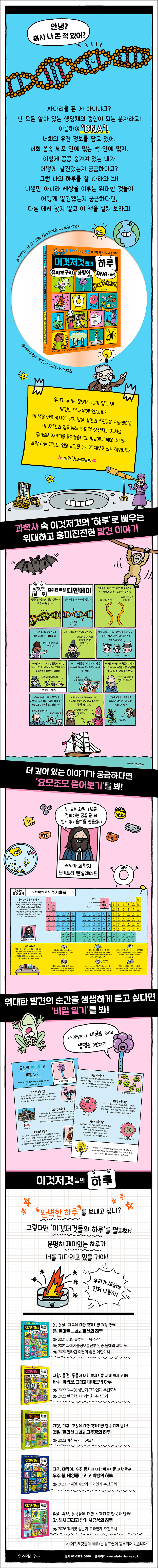 전염병을 예방하는 ‘백신’, 주기율표를 가득 메운 ‘원소’, 다친 곳을 훤히 보여 주는 ‘엑스선’. 너무나 익숙해서 원래 있던 것처럼 여겨지는 우리 주변의 모든 것들은 누군가가 호기심을 가져서, 끈질기게 탐구해서, 혹은 우연히 ‘발견한’ 덕분에 지금 우리 곁에 있다. 세상 곳곳 이것저것의 ‘하루’를 알아보는 〈이것저것들의 하루〉 시리즈의 여섯 번째 책 『이것저것들의 하루 6: 유리개구리, 곰팡이 그리고 DNA의 하루』는 ‘위대한 발견’에 관한 이야기를 담았다. 만화 형식으로 익살스럽게 풀어낸, 세상에서 가장 유명한 발견의 순간과 그것을 이루어 낸 과학자들의 이야기를 읽다 보면 딱딱하고 어렵게만 느껴지던 과학이 어느새 한 뼘 더 가까이 다가와 있을 것이다.