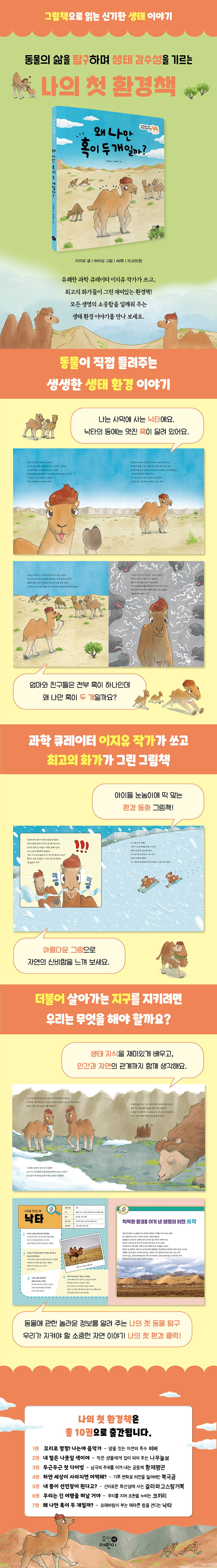 나의 첫 환경책 7권 『왜 나만 혹이 두 개일까?』의 주인공은 사막에 사는 낙타 ‘티메’입니다. 티메는 등에 멋진 혹을 두 개나 가지고 있어요. 하지만 티메의 엄마도, 친구들도 전부 혹이 하나입니다. 남다른 생김새 때문에 티메의 고민이 깊어지던 어느 날, 단봉낙타 마을에 돌림병이 퍼지고 맙니다. 티메는 돌림병을 고칠 수 있는 이끼를 찾으러 높은 고원을 향해 떠나기로 결심하지요. 혼자 모험을 시작한 티메는 자신과 닮은 쌍봉낙타들을 만나며 새로운 세상을 경험하게 됩니다.