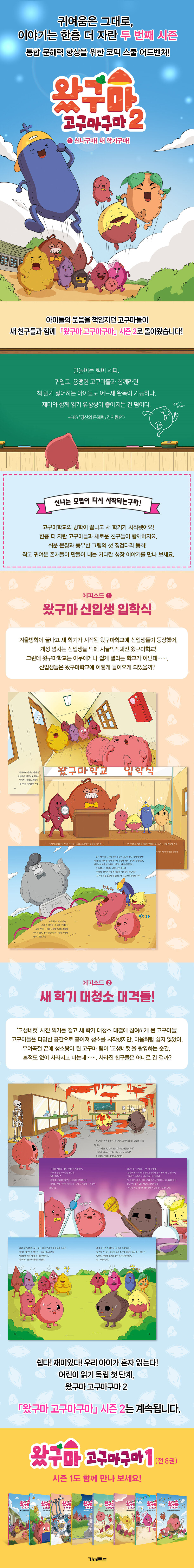 초등 독자들을 사로잡은「왔구마 고구마구마」가 한층 확장된 이야기로 다시 시작됩니다. 「왔구마 고구마구마」시즌 2는 기존 고구마 캐릭터들의 익숙한 매력을 그대로 유지하면서도, 새로운 캐릭터들이 등장하고, 학교라는 무대를 통해 더욱 풍성해진 이야기와 관계를 담아냅니다. 「왔구마 고구마구마」는 개성 넘치는 고구마 캐릭터들이 펼치는 학교 이야기를 통해, 어린이들이 자연스럽게 읽기의 재미를 경험할 수 있도록 구성된 시리즈입니다. 풍부한 그림과 쉬운 텍스트가 유기적으로 결합되어, 글 읽기가 익숙하지 않은 어린이도 이야기의 흐름을 쉽게 따라갈 수 있으며, 이제 막 혼자 읽기를 시작한 초등 저학년 독자들이 읽기 유창성과 통합 문해력을 키울 수 있도록 돕습니다. 또한 다양한 고구마 캐릭터들을 통해 ‘친구와 학교, 그리고 나’라는 세계를 따뜻하게 그려냄으로써, 어린이들이 관계 속에서 성장해 가는 과정을 자연스럽게 담아냅니다. 더 새롭고 흥미진진해진 고구마들의 학교생활, 「왔구마 고구마구마」시즌 2를 통해 작고 귀여운 존재들이 만들어내는 커다란 성장 이야기를 만나 보세요.