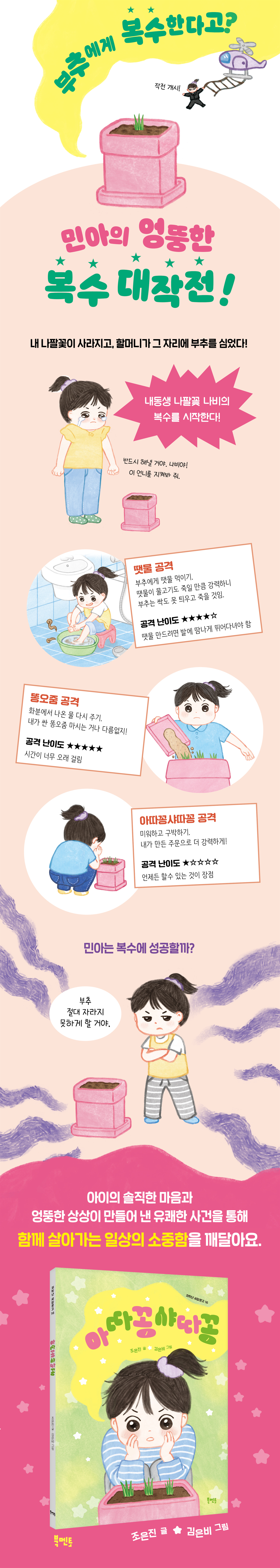 아이들의 마음은 때론 아주 단순해요. 그래서 속상한 일이 생기면 그 이유를 따져 보기보다 먼저 화내고, 그 마음은 곧바로 엉뚱한 상상으로 이어지기도 하지요. 민아에게도 그런 일이 벌어집니다. 아끼던 나팔꽃 ‘나비’가 사라지고, 그 자리에 부추가 심어진 것을 본 민아는, 나비를 없앤 사람이 할머니라고 믿어 버립니다. 그리고 나비를 대신해 복수하기로 마음먹지요. 민아의 복수 작전은 어른들의 눈에는 우스꽝스럽지만, 민아에게는 아주 진지한 일이지요. 민아는 부추가 자라지 못하게 발을 씻은 땟물을 붓고, 책과 인터넷을 뒤져 식물을 티 안 나게 죽이는 방법을 찾아보고, 마침내 ‘아따꽁샤따꽁’이라는 주문까지 만들어 냅니다. 민아가 혼자서 골똘히 고민하고 상상하며 만들어 낸 이 엉뚱한 작전들은 아이들 특유의 솔직하고 직선적인 마음을 생생하게 보여 주면서 큰 웃음을 선사하지요.