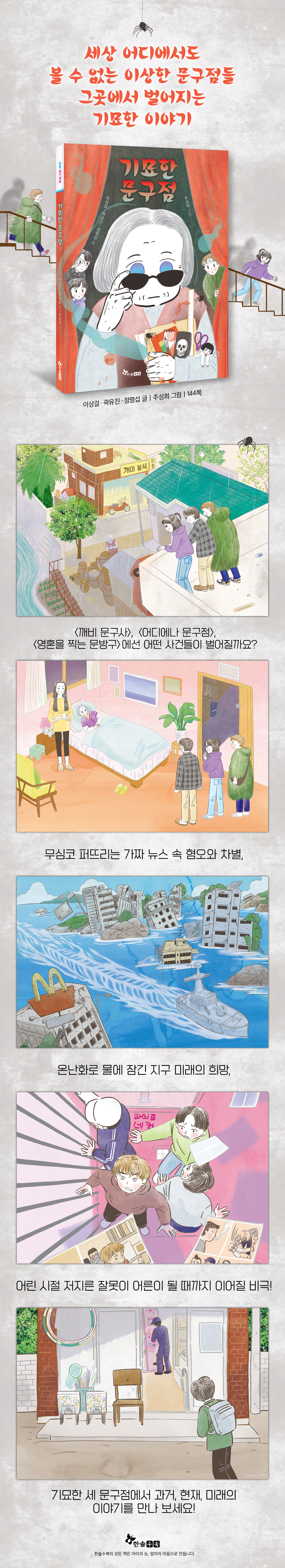 골목 안 아주 오래된 문방구에서 라이프 네 컷 무인 사진기를 발견한 유찬이는 호기심을 품고 안으로 들어가요. 그런데 뭔가에 쫓기다가 경찰에 잡히는 모습이 찍히고, 그것이 자신의 미래 모습일지도 모른다는 말을 듣고 기분이 찜찜해져요. 〈영혼을 찍는 문방구〉의 유찬이는 자신의 미래를 바꿀 수 있을까요? 이 이야기는 어린 시절에 저지른 잘못들을 바로잡지 않고 반성하지 않았을 때 얼마나 참혹한 결과를 마주해야 하는지 깨닫게 해줍니다. 이제 흥미진진한 『기묘한 문구점』에서 과거, 현재, 미래의 이야기를 만나 보세요!