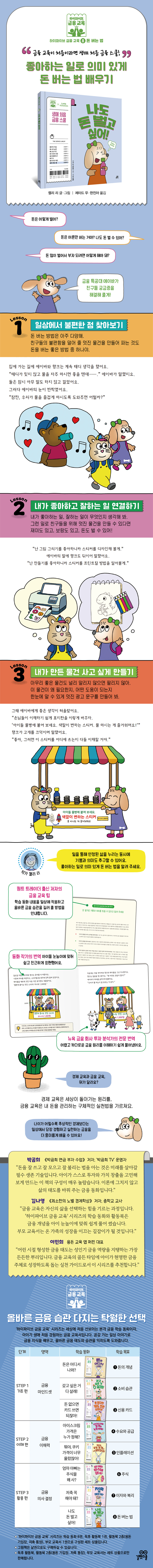 『나도 돈 벌고 싶어!』는 세상에 처음 선보이는 본격 금융 학습 시리즈 ‘하이파이브 금융 교육’ 의 여덟 번째 책입니다. 동물 마을 금융 특공대 에이바와 행크가 친구들을 위해 물병 스티커를 만들어 팔면서 일을 통해 보람과 의미를 찾고 돈도 벌 수 있다는 사실을 깨달아 가는 과정을 그리고 있어요.