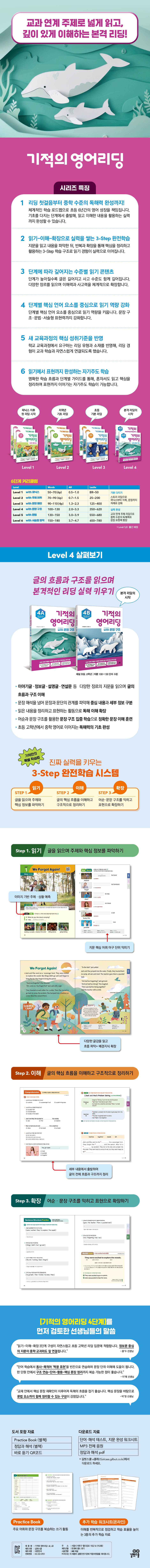 『기적의 영어리딩』 시리즈는 파닉스 이후 첫 리딩부터 중학 수준의 독해 완성까지, 초등 6년간의 영어 성장을 체계적으로 이끌어주는 6단계 리딩 프로그램입니다. 초기 단계에서는 스토리 리딩을 통해 영어 읽기의 기초를 다지고, 이후 단계에서는 교과와 연계된 다양한 주제의 글을 읽으며 글의 구조를 파악하고 정리·표현하는 실력 중심의 리딩으로 확장됩니다. 이 시리즈만의 ‘3-Step 완전학습 시스템’을 통해 하나의 지문을 읽고 이해한 뒤 표현으로까지 연결하며, 어휘력·문장력·사고력이 단계적으로 성장하도록 설계했습니다. 『기적의 영어리딩』은 영어 읽기의 기초부터 활용까지, 단계별로 완성해 가는 초등 영어 문해력 로드맵입니다.