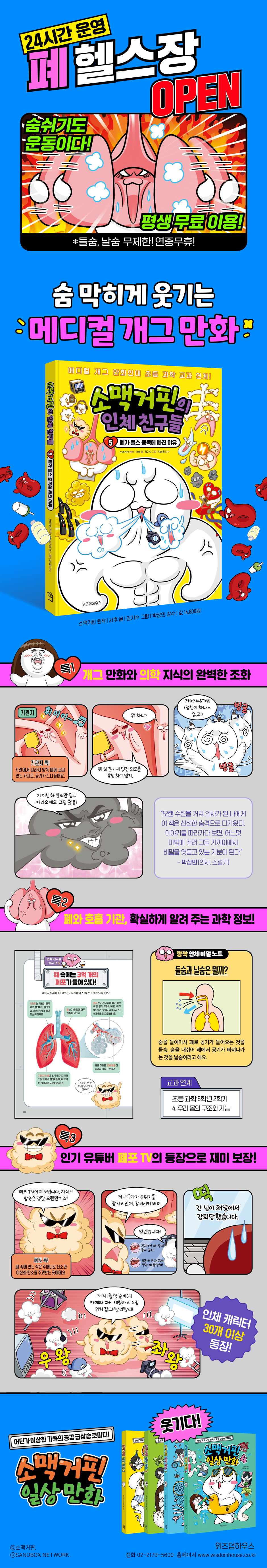 총 조회수 약 6,300만 회의 인기 동영상 ‘인체 친구들의 하루’를 바탕으로 한 〈소맥거핀의 인체 친구들〉 시리즈는 책만의 오리지널 스토리로 매 권 새로운 인체 캐릭터가 등장한다. 5권에서는 산소와 이산화 탄소가 교환되는 폐포는 물론, 코와 입, 목의 각종 기관들이 각각의 특징을 살린 캐릭터로 등장해 사레, 기침, 코딱지, 딸꾹질 등 호흡과 관련된 재미있는 주제로 관련 인체 지식을 친근하게 전달한다. 낱말 판 속에서 인체 친구들의 이름을 찾는 글자 퍼즐과 OX 퀴즈와 함께하는 미로 찾기로는 유익함과 재미를 동시에 느낄 수 있다.