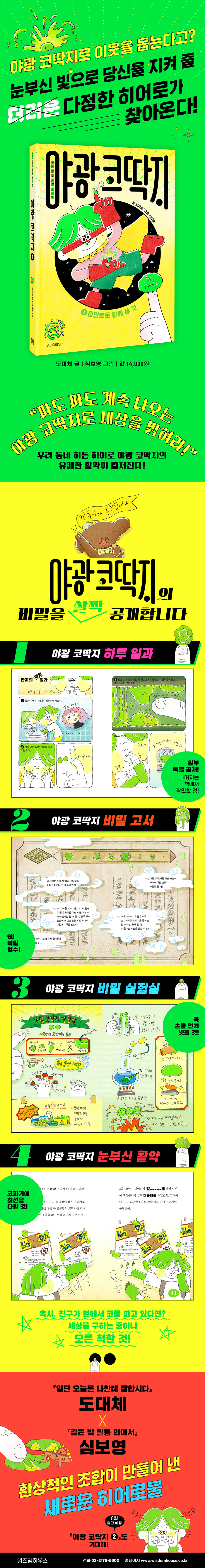 이 책은 자신만의 엉뚱한 재치와 유머로 팍팍한 삶을 헤쳐 나가는 에세이 『일단 오늘은 나한테 잘합시다』로 수많은 독자들의 사랑을 받은 도대체 작가의 첫 어린이책이다. 도대체 작가를 표현할 수 있는 가장 대표적인 문장은 아마도 ‘도대체 작가만이 쓸 수 있는 이야기’일 것이다. 뛰어난 관찰력과 순발력 그리고 어느 순간에도 놓지 않는 유머 감각으로 일상을 담은 그간의 창작 활동은 ‘야광 코딱지’라는 엉뚱하고 사랑스러운, 생활 밀착형 히어로를 탄생시켰다. 여기에 『깊은 밤 필통 안에서』 등을 비롯해 다양한 어린이책에 그림을 그려 온 심보영 작가의 밝고 따뜻한 그림이 더해지면서 분명 더러운데 더럽지 않은 야광 코딱지의 독창적인 세계가 완성되었다. 특히 심보영 작가는 탁월한 상상력으로 단지의 콧구멍 안에서 살아 움직이는 듯한 코딱지들의 세계를 위트 있게 표현해 보는 재미를 더해 준다.
